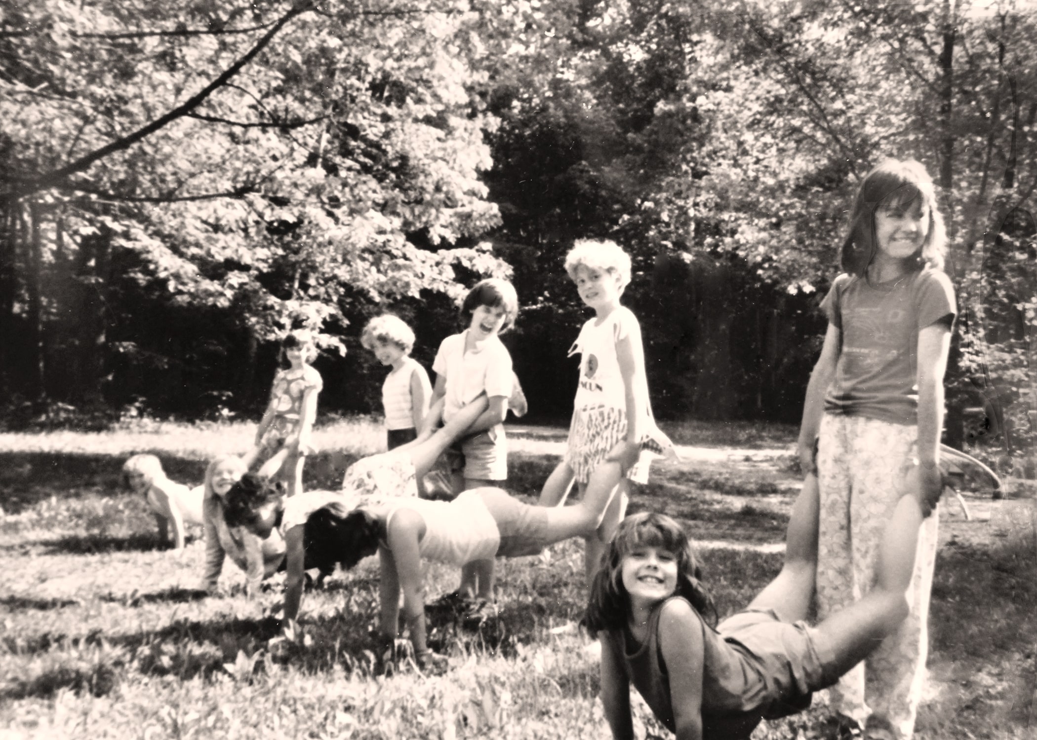 Then: Gibraltar Troop 369 at the starting line for a wheelbarrow race, circa 1987. Standing second from left is Land Trust Director of Charitable Giving Cinnamon Rossman. Standing second from right is current Gibraltar Girl Scout Co-Leader Sarah Martin.