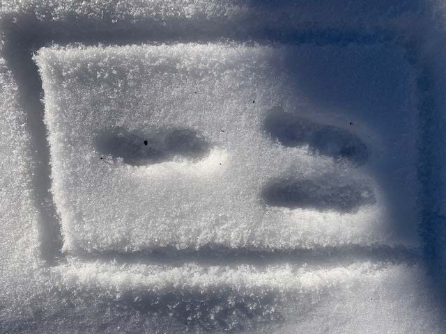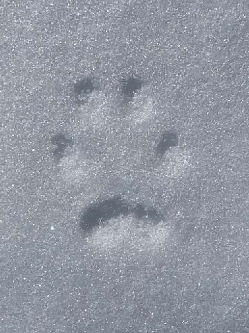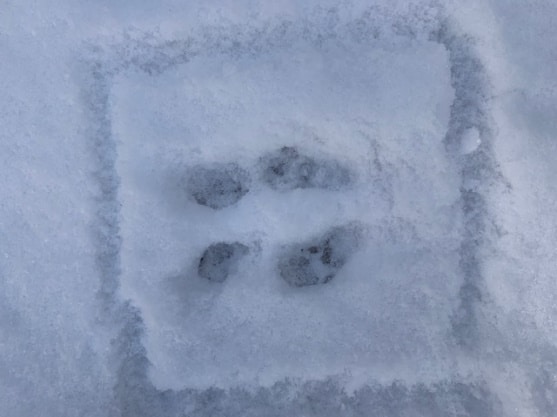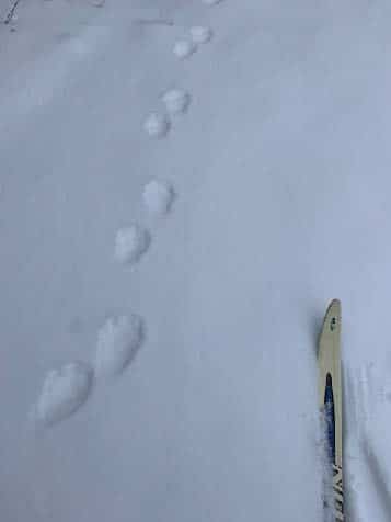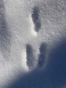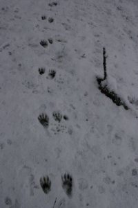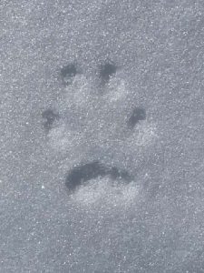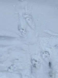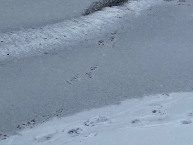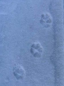 Fox and coyote as canines leave a generally straight line of tracks when walking or trotting. You will also usually see toenail marks in canine tracks, look at more than just one track to be sure as depending on the snow depth sometimes the nails show and sometimes, they do not. Domestic dog tracks look very similar to coyote and fox but the spacing between the toepads is usually wider than their wild cousins. Why? They are usually overweight, too many treats lead to wider spaced toes!